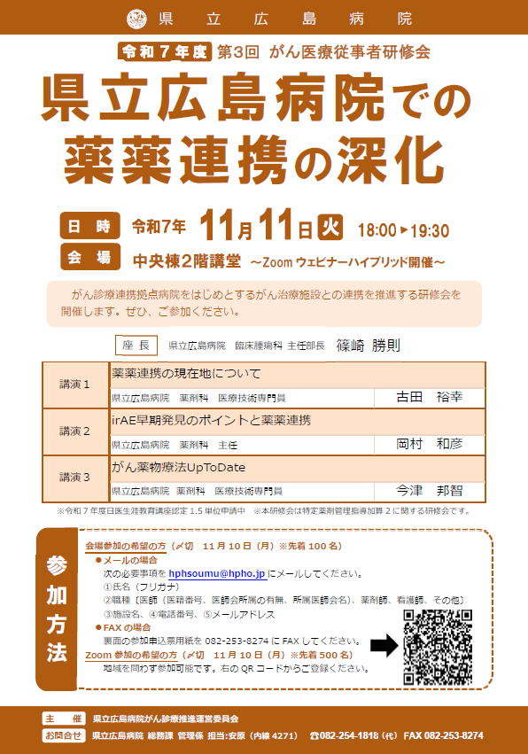県立広島病院では、地域がん診療連携拠点病院の取組みの一環として、がん医療に携わる医療従事者(医師・看護師・薬剤師等)を対象とした研修会を開催しています。
