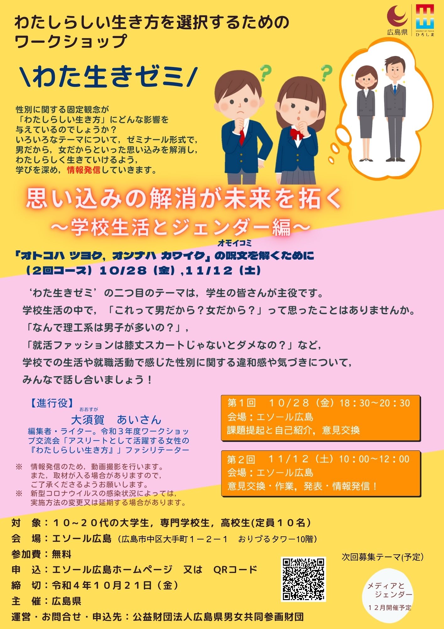 わたしらしい生き方を選択するためのワークショップ \わた生きゼミ/では,「男だから○○しなければ」,「女だから○○に違いない」といった性別に関する思い込みの解消に向け,様々なテーマについて,少人数のゼミナール形式のワークショップを行い,「わたしらしく」生きていけるよう,学びを深め,情報発信していきますので,ぜひご参加ください!